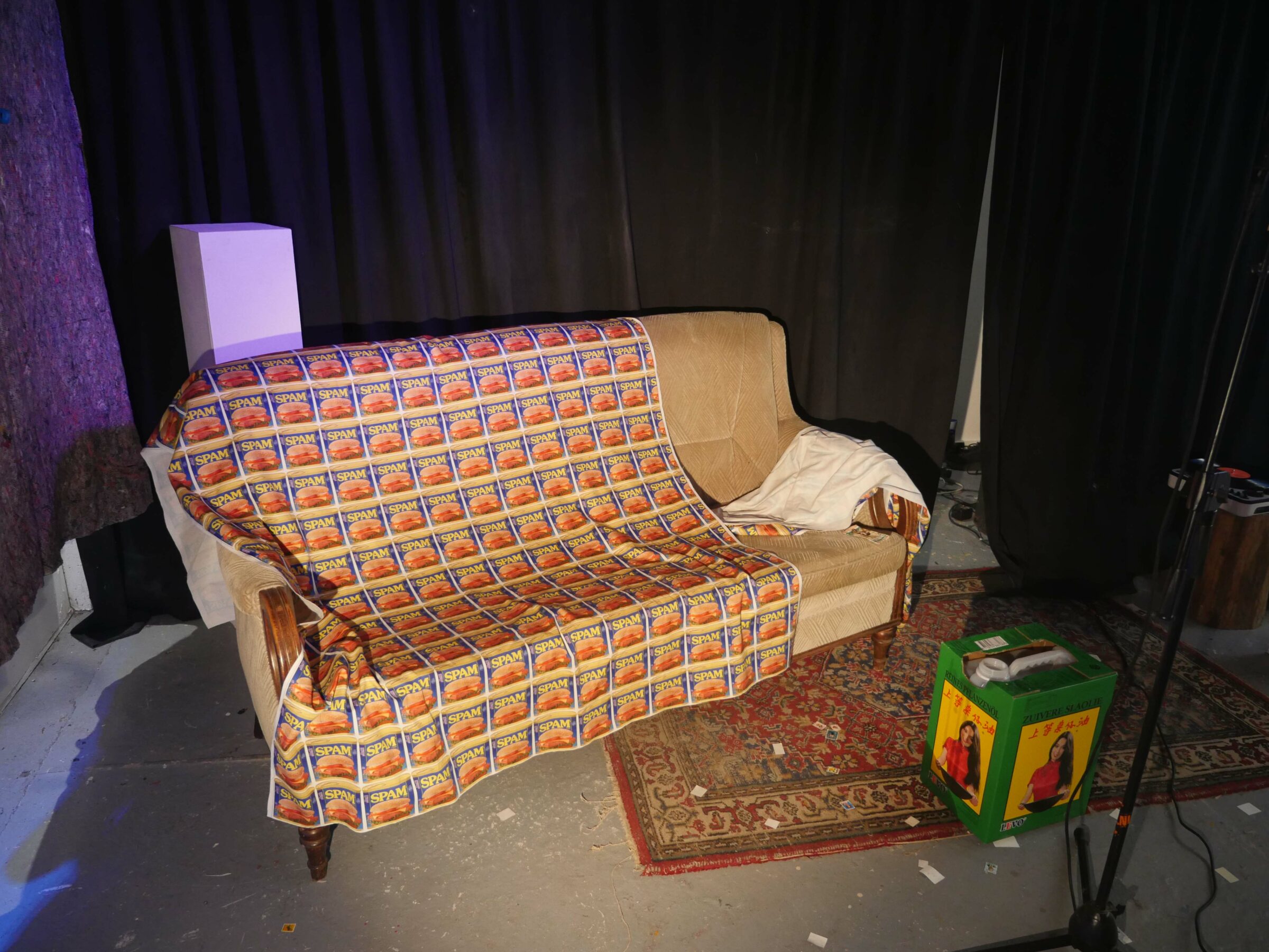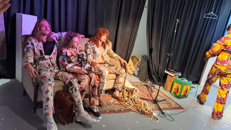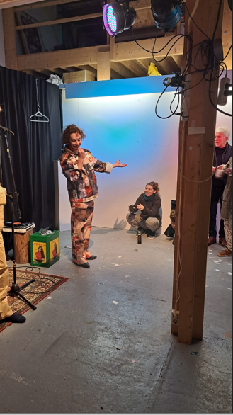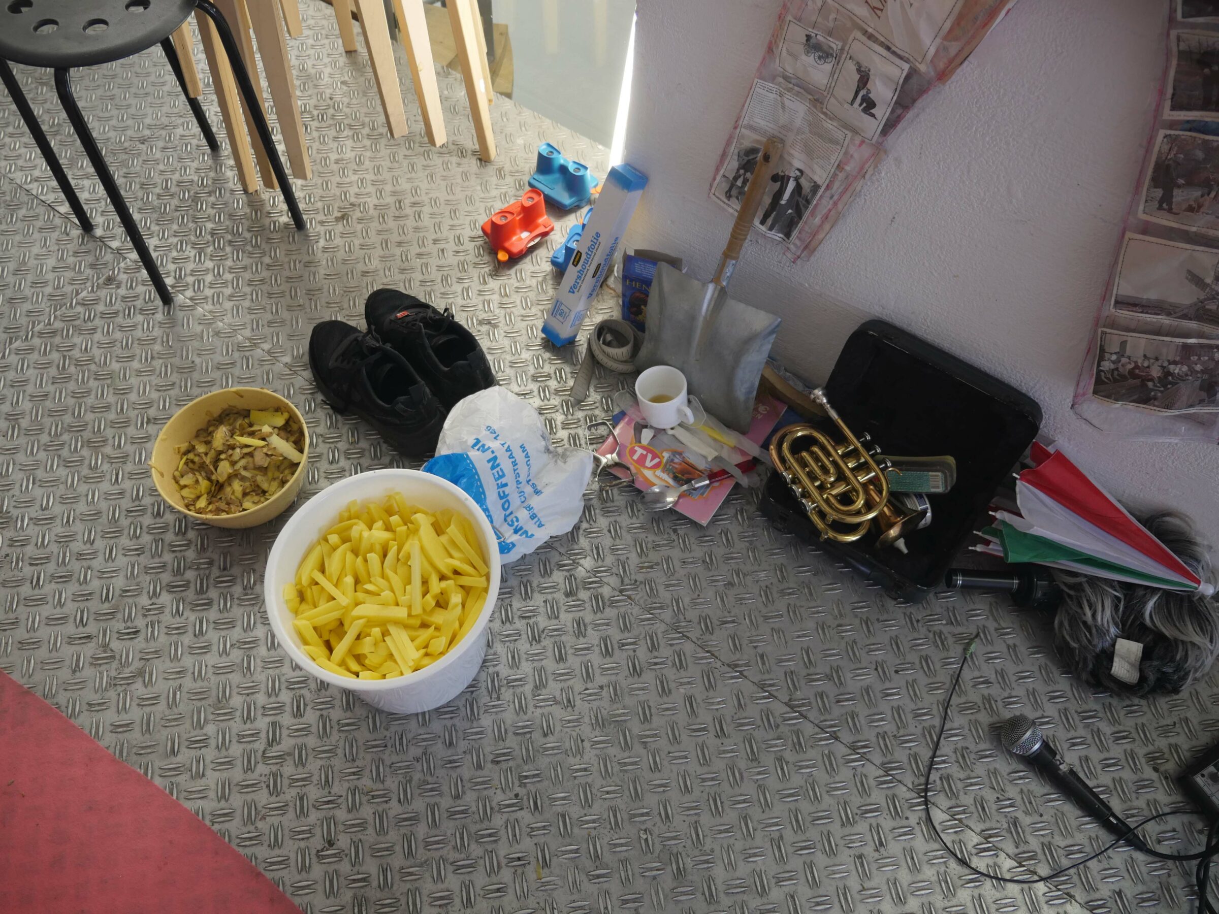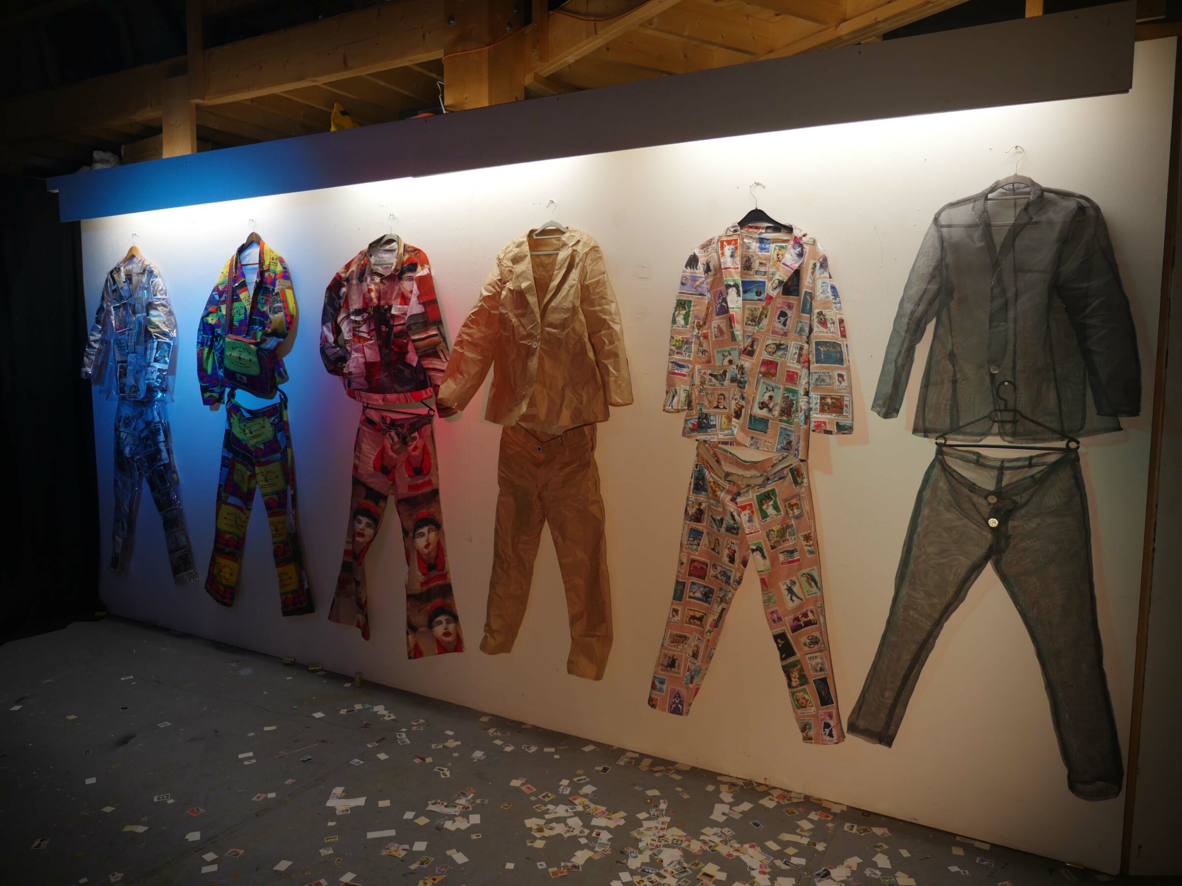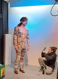 In september 2022, I did the WEARABLES recidency, organised by SIGN in Groningen. SIGN organises projects for young artists. Since my mother comes from Groningen, i visited the city since a young age now and then. This is why i have memories of Groningen since i was a kid. With this mindset of looking at things that are there for a long time i wandered around the city and took inspiration from logos and other graphic material, like a 3D viewer that layed around for years and then you look at it again, unchanged, but matured by time. As an extra in the show, i ordered custom made 3D viewers with pictures of Groningen and Rotterdam selected by me, that i also used for the clothing designs. For example i made a suit with stamps from a Philatelic Association (stampcollectors shop). The shop is there already for decades probably, since its members are in there late 70s. It was a nice encountering, and i bought hundreds of old stamps from all over the world, and made a suit out of it by scanning them and let them be printed on fabric by a print on fabric company called House of U. During this recidency i took two sewing lessons from Esther at studio Draadkracht, so i can finally make clothes myself. But at Draadkracht i also met Assane, a pro sewer from Senegal, he helped me with making 3 suits. The others i made myself. At the fashionshow that i organised on 29 september at the location ‘Moshpit of creation’ the models and fellow artists Elias, Alex and Leon supported the show. Big thanks to them. And also ofcourse thanks to Ron, Mariejeanne, and Klaas, the people of SIGN. And Chiara of moshpit of creation who provided the workspace as a satallite location of SIGN. Me and Assane with left a suit based on a photo of the Jewelryshop Prins Gold in Rotterdam. It has a fascinating facade in the pre war Art Deco style, but painted totally white and red. Its really beatiful, totally my style. It should get a monumental status, so its not allowed to paint grey in the future.Did a little show at SIGN, peeling potatoes, to turn into fries at the ship Of Klaas and Mariejeanne. Would fancy them right now. Made a fly as a brosh for the fly suit made from insect screen as seen on the right of the next picture out of sunglasses. Here i wear the suit with imagepattern from a kids hip hop bag with images of New York in the background. Paper suit, just like the paper suit made by pop artist James Rosenquist in the 60s.Alex wearing the Collagesuit, made of ‘coronaplastic’ bought at Bauhaus fully stitched with images from books and newspapers that i found at thriftstores like Mamaminis; Groningens legendary secondhandshop with multiple branches. Groningen is the secondhandshop capital of the Netherlands. Elias Elgersma, known as performer Huub Prins and his band The Homesick. Wearing the Prins Gold Jewelryshop suit. He made cool movements with his hands like a mimeplayer. detail of the plastic collagesuitLeon throwing all the stamps on the audience, Leon is a sounddesigner and musician.The models Leon, Elias, and Alex.Fabric with the logo of SPAM, during the show i sang the song SPAM of Monty Piton with Ron. The fabric was draped around the bench, resulting in a cheap/simple tv show setting. Another photo i used to make a pattern with, but its not yet a suit. Copyright is the copyshop of Groningen, a funny wordplay.