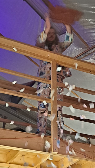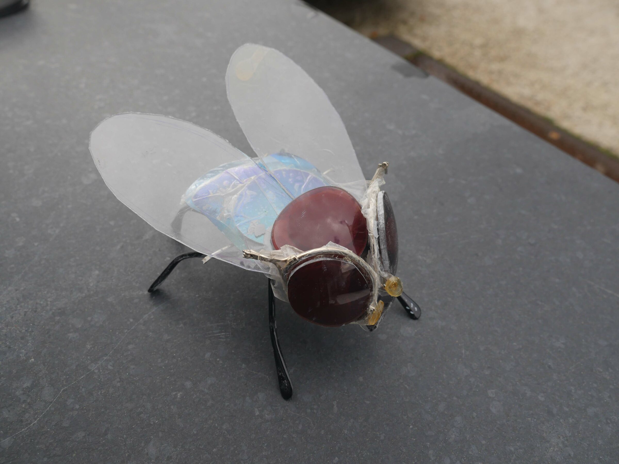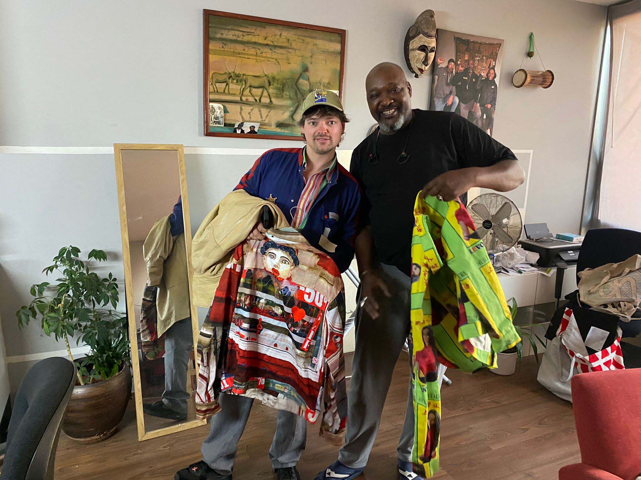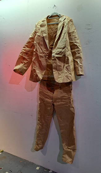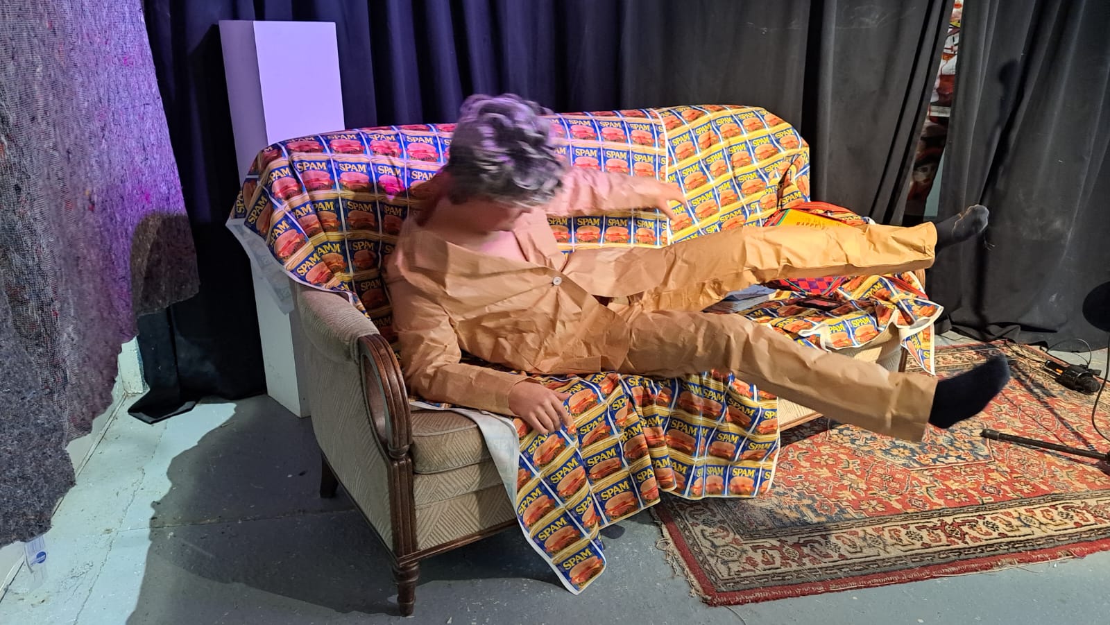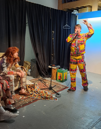 In september 2022, I did the WEARABLES recidency, organised by SIGN in Groningen. SIGN organises projects for young artists. Since my mother comes from Groningen, i visited the city since a young age now and then. This is why i have memories of Groningen since i was a kid. With this mindset of looking at things that are there for a long time i wandered around the city and took inspiration from logos and other graphic material, like a 3D viewer that layed around for years and then you look at it again, unchanged, but matured by time. As an extra in the show, i ordered custom made 3D viewers with pictures of Groningen and Rotterdam selected by me, that i also used for the clothing designs. For example i made a suit with stamps from a Philatelic Association (stampcollectors shop). The shop is there already for decades probably, since its members are in there late 70s. It was a nice encountering, and i bought hundreds of old stamps from all over the world, and made a suit out of it by scanning them and let them be printed on fabric by a print on fabric company called House of U. During this recidency i took two sewing lessons from Esther at studio Draadkracht, so i can finally make clothes myself. But at Draadkracht i also met Assane, a pro sewer from Senegal, he helped me with making 3 suits. The others i made myself. At the fashionshow that i organised on 29 september at the location ‘Moshpit of creation’ the models and fellow artists Elias, Alex and Leon supported the show. Big thanks to them. And also ofcourse thanks to Ron, Mariejeanne, and Klaas, the people of SIGN. And Chiara of moshpit of creation who provided the workspace as a satallite location of SIGN. Me and Assane with left a suit based on a photo of the Jewelryshop Prins Gold in Rotterdam. It has a fascinating facade in the pre war Art Deco style, but painted totally white and red. Its really beatiful, totally my style. It should get a monumental status, so its not allowed to paint grey in the future.Did a little show at SIGN, peeling potatoes, to turn into fries at the ship Of Klaas and Mariejeanne. Would fancy them right now. Made a fly as a brosh for the fly suit made from insect screen as seen on the right of the next picture out of sunglasses. Here i wear the suit with imagepattern from a kids hip hop bag with images of New York in the background. Paper suit, just like the paper suit made by pop artist James Rosenquist in the 60s.Alex wearing the Collagesuit, made of ‘coronaplastic’ bought at Bauhaus fully stitched with images from books and newspapers that i found at thriftstores like Mamaminis; Groningens legendary secondhandshop with multiple branches. Groningen is the secondhandshop capital of the Netherlands. Elias Elgersma, known as performer Huub Prins and his band The Homesick. Wearing the Prins Gold Jewelryshop suit. He made cool movements with his hands like a mimeplayer. detail of the plastic collagesuitLeon throwing all the stamps on the audience, Leon is a sounddesigner and musician.The models Leon, Elias, and Alex.Fabric with the logo of SPAM, during the show i sang the song SPAM of Monty Piton with Ron. The fabric was draped around the bench, resulting in a cheap/simple tv show setting. Another photo i used to make a pattern with, but its not yet a suit. Copyright is the copyshop of Groningen, a funny wordplay.