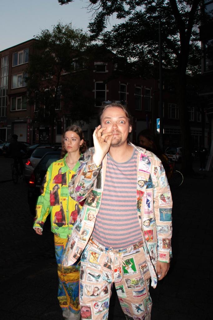 links een outfit op basis van een kleurig hip hop tasje dat ik vond op de markt. Rechts een outfit geïnspireerd op de olieblikken die veel op straat liggen bij toko’s.links: Correct outfits, van de bekende gedateerde elektronica winkel, maakte ik in samenwerking met Nada van Dalen. Rechts een SPAM outfit, van dat vieze vlees in een blikje. Ik deed er een imitatie mee van Monthy Pytons’ ‘Eggs, bacon, and Spam’, tijdens de eerste presentatie van deze collectie.rechts een postzegelpak: oude postzegels uit onder andere Polen, Noord Korea, en de VS. op mijn rug een cape van Lays chips met daarop een variatie op een quote van Sun Ra, We travel the space lays.