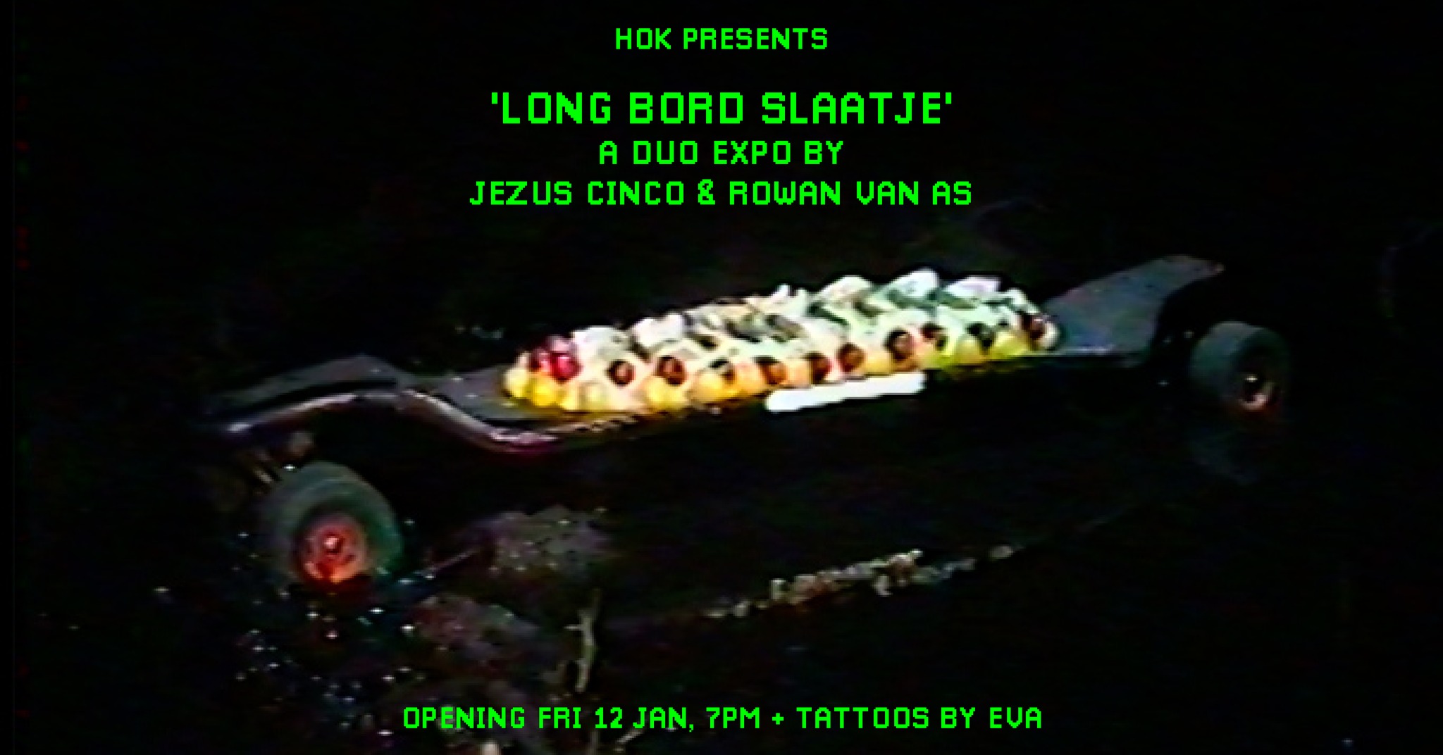 Well, bring along that salad and let us enjoy it on a long board! All you skaters, longboarders, trash art and New York lovers, you are all invited to this very special duo-exhibition by Jezus Cinco and Rowan van As in HOK.